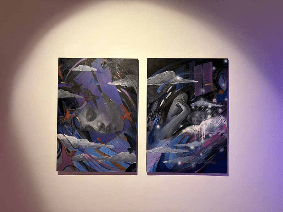 In times of constant distress, sleep becomes a necessity, a ritual, and at times the only remedy. Through forms and figures, the artist searches for spaces of rest and reflection, reconfiguring reality through a dreamlike lens. Each work, like a dream, becomes a window, carrying the artist’s inner world while opening onto collective encounters.